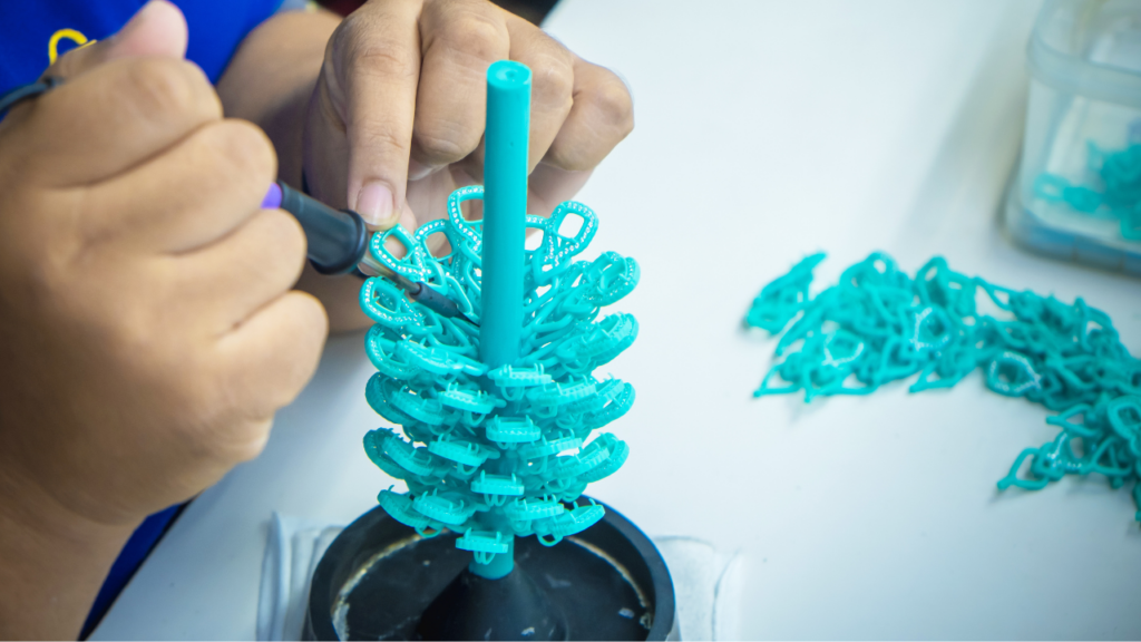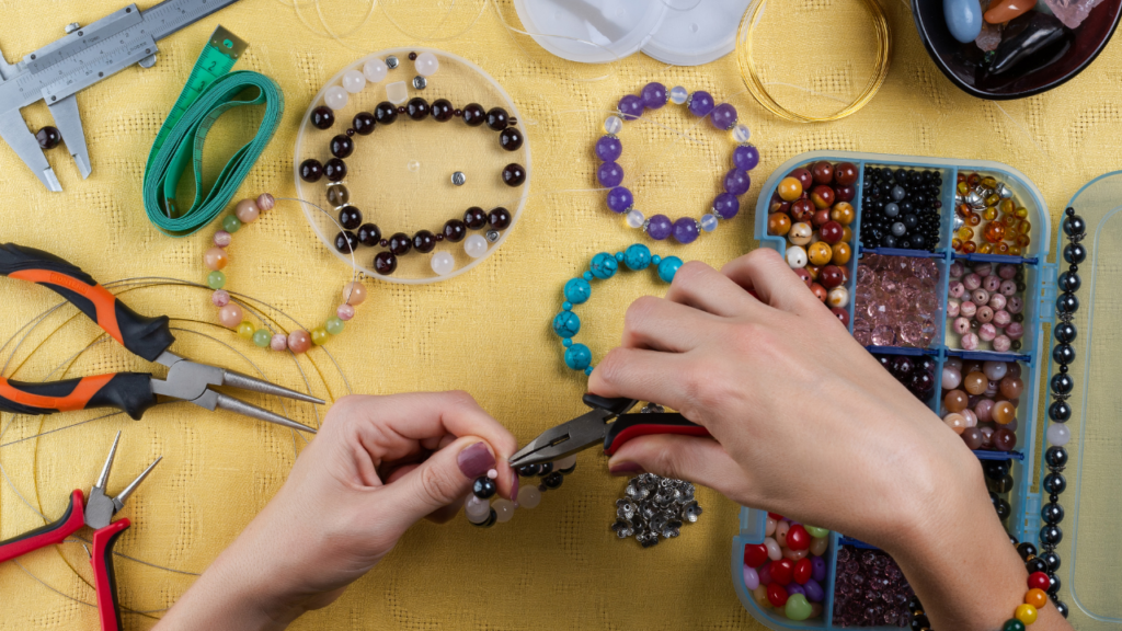 - Stringing beads on wire to create a necklace